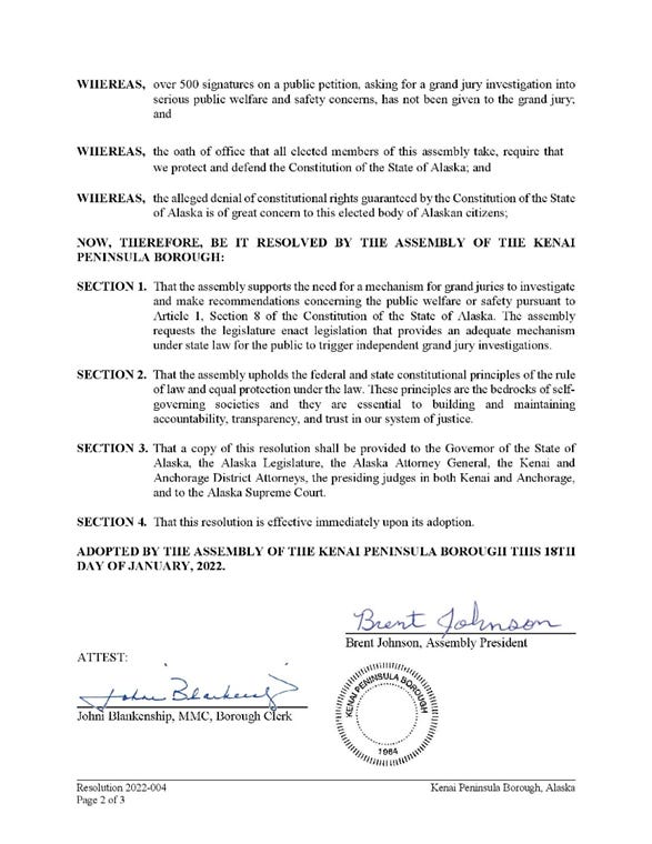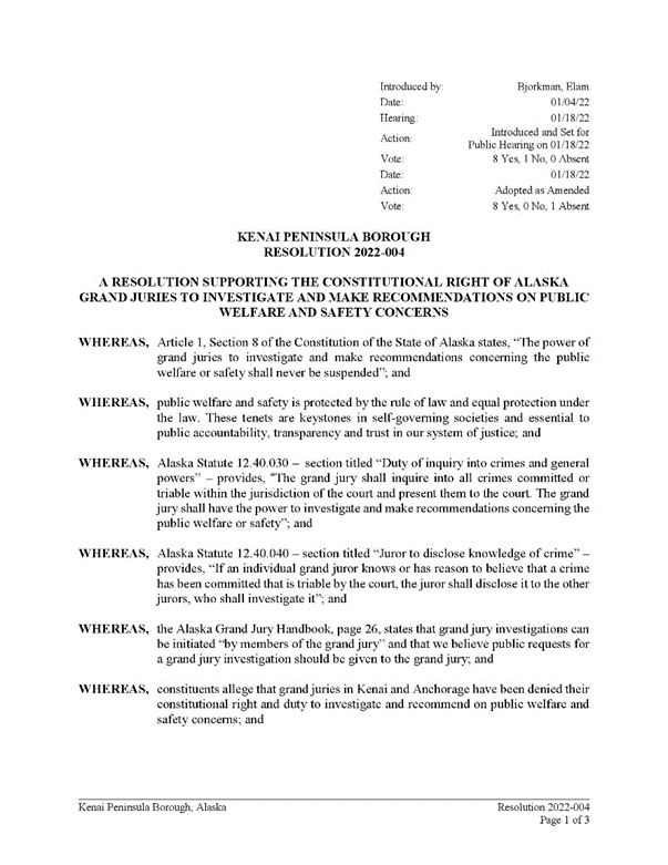 The Kenai Peninsula Borough Assembly unanimously passed Resolution 2022-004 “Supporting the Constitutional Right of Alaska Grand Juries to Investigate and Make Recommendations on Public Welfare and Safety Concerns.”