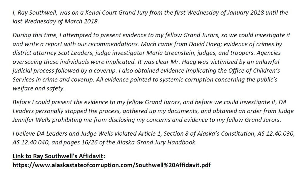 Haeg continued: But what may be the most important point of your entire story, Donn, is the big picture of what every other state is doing. I looked at other states to try to figure out where we are in comparison. I believe the model used in California is the best; they , ran into the same problem we have in Alaska and fixed it with two categories of grand jury: 1) a criminal grand jury, that the prosecutor uses to get criminal indictments, and 2) a separate grand jury of all different people, called a Civil Grand Jury dedicated to dealing with wrongdoing in government. By law no judge or prosecutor are allowed to attend the civil grand jury proceedings. Only common citizens are allowed to participate in investigation of government wrongdoing and corruption.