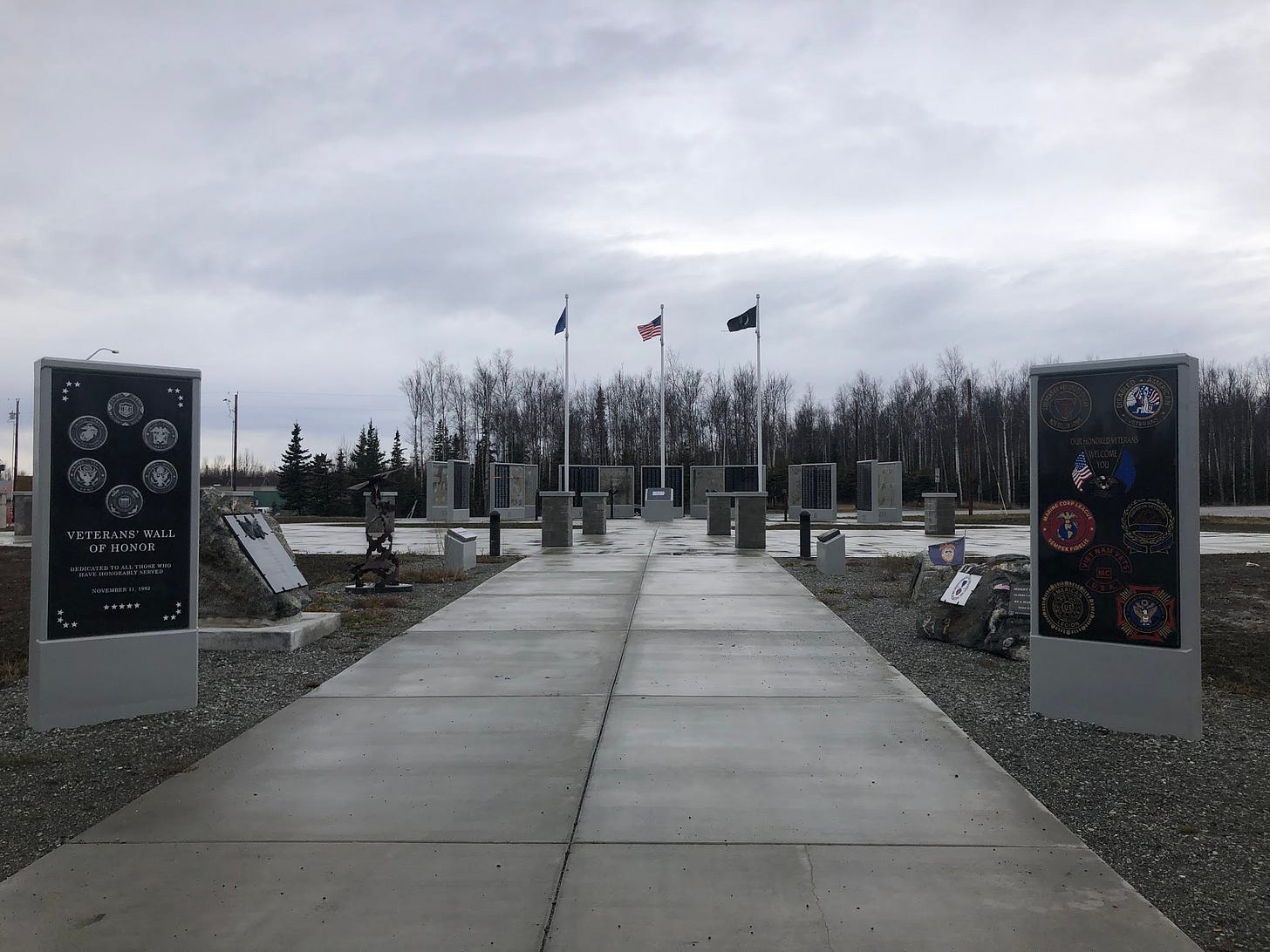 The City of Wasilla gave the Veteran organization nine-tenths of an acre for the wall in front of where the old Iditarod School was located. Phase I was done last year, including moving the original 7 panels from the old location to the new location. Phase 2, this year included putting up 6 new panels, providing space for an additional 2,000 names, explained Cottle. Concrete installation was set the third week of October providing room for an additional row or two of panels. Six large insignias, one for each of the branches of military, are in route. What the City of Wasilla agreed to was “we will pay for electricity, we will make sure it is maintained, through AMVETS or American Legion. We’re working on a $250,000 grant from the Rasmuson Foundation and I think there are 8 pillars up now. Next summer we hope to put up a pavilion. I guarantee it will look nice; I’ve got 10 family members on that wall.