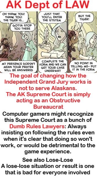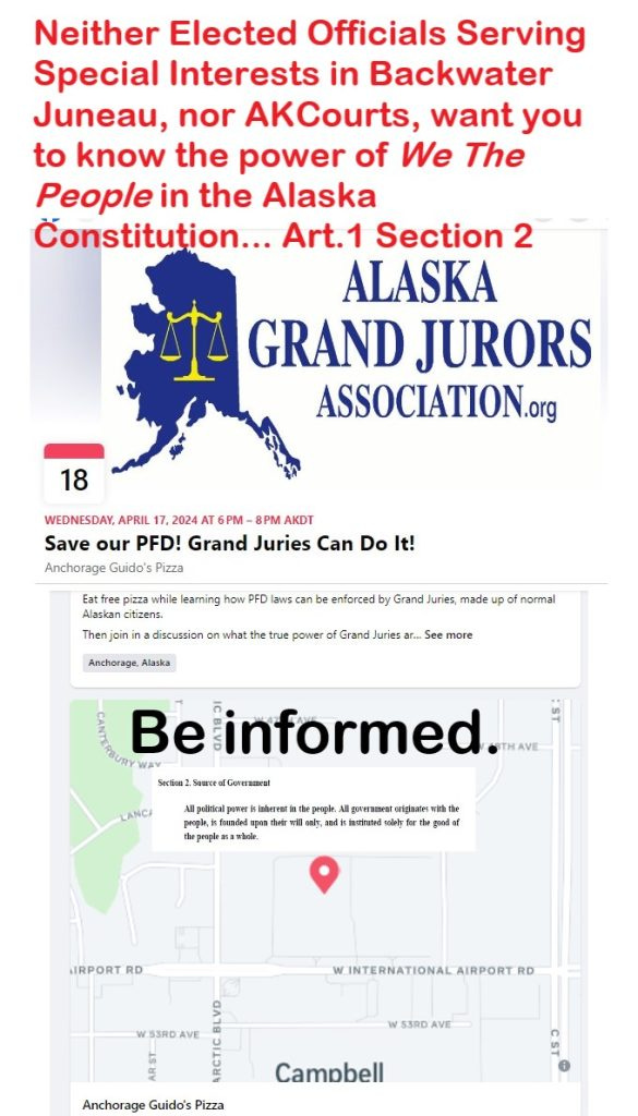 The Lords at Court don’t think violation of individual Alaskans by public officials is worthy of Grand Jury attention in direct contradiction to intent of the founding fathers when the AK Constitution was written.