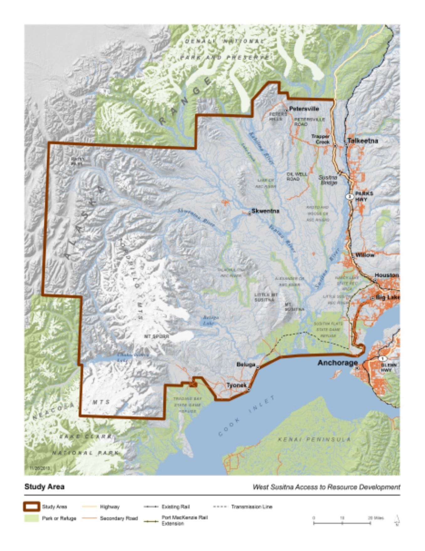 While nearly the size of Vermont, the Study Area has a diverse natural resources base. These natural resources include hardrock minerals, placer gold, coal, oil and gas, forestry/timber, agriculture, alternative energy options, and recreational resource opportunities, such as sportfishing and hunting. Surface access to most of this area, however, is minimal or non-existent. This study aims to identify locations that may benefit from a proposed surface connection and evaluates the potential access routes.