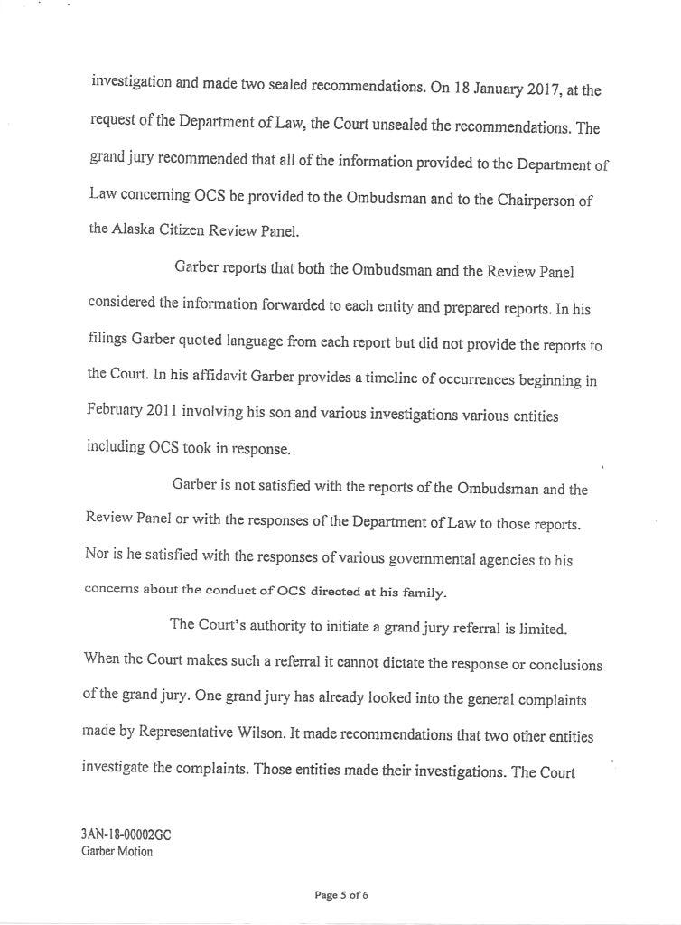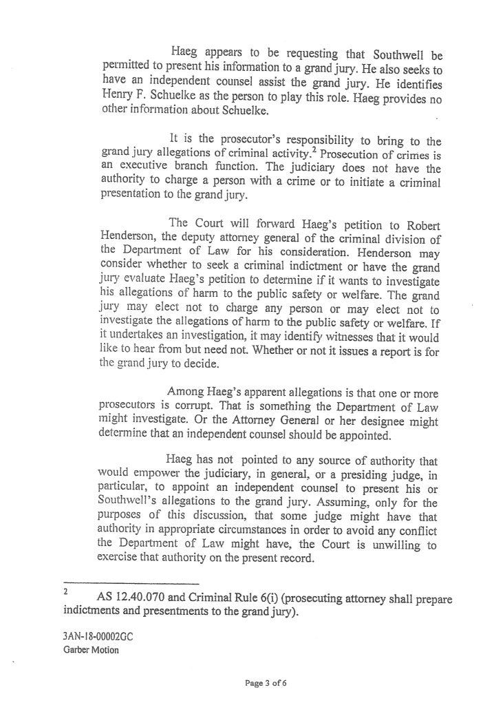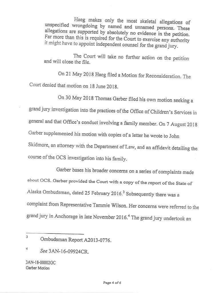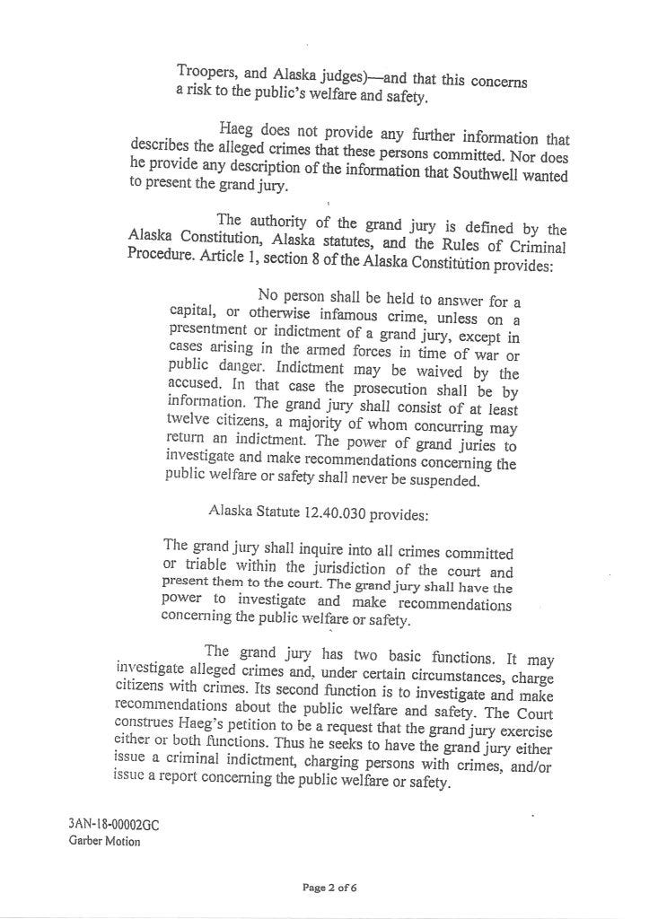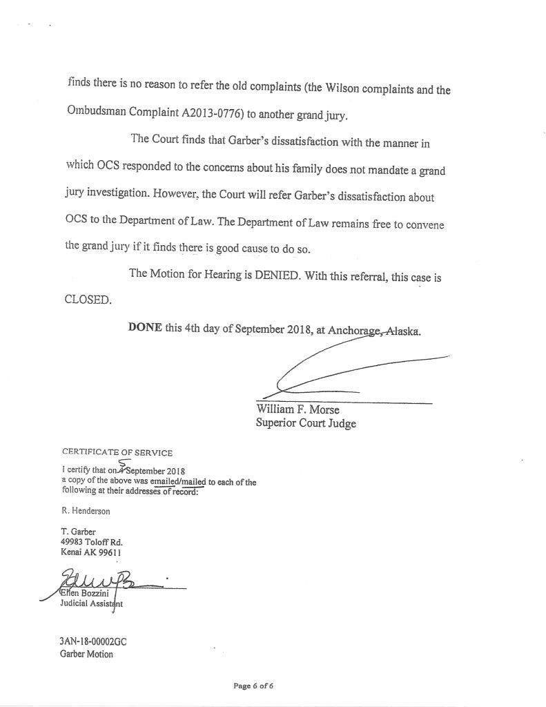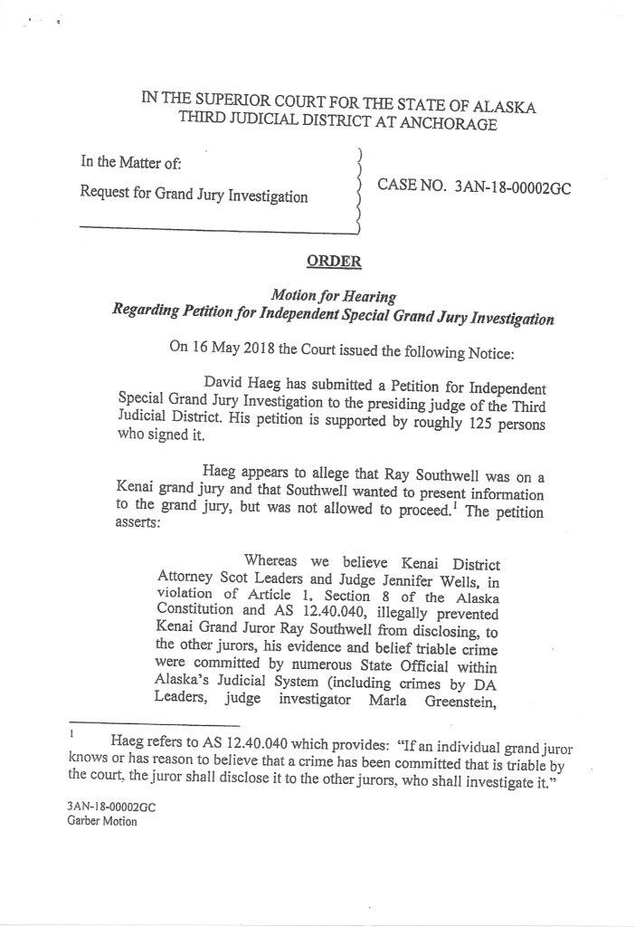 Judge Morse denied Garber’s petition with an Order September 4, 2018. It corresponded with David Haeg’s efforts to get a Grand Jury Investigation in Kenai.