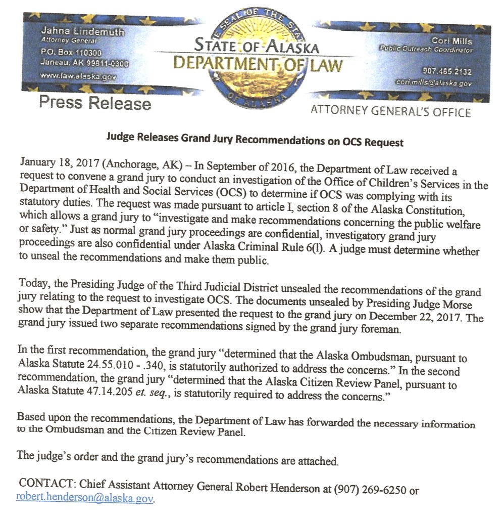 Those grand jury recommendations were released by Judge Morse in January 2017. Rep. Wilson’s Grand Jury specifically stated that under Alaska Statute 24.55.010 – .340, the Ombudsman is Statutorily authorized. And, under Alaska Statute 47.14.205, the Citizen Review Panel is Statutorily required to address the concerns. Currently neither the Ombudsman nor CRP have officially announced active investigations of Children’s Services.