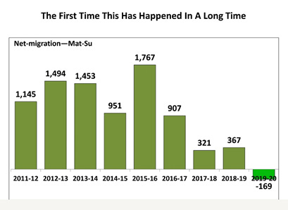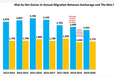 Still Alaskans continue to move from Anchorage to MatSu in greater numbers than those moving from the valley to Anchorage. Obviously, many feel the 30+ mile drive to work each way is worth it.