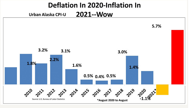 Alaskans understand what it is like to live in an inflated economy. Transportation costs impact everything we buy from other states and abroad. But result of this political whiplash has been dramatic for Alaska. Deflation in 2020 bounced back to 5.7 percent inflation to our economy.