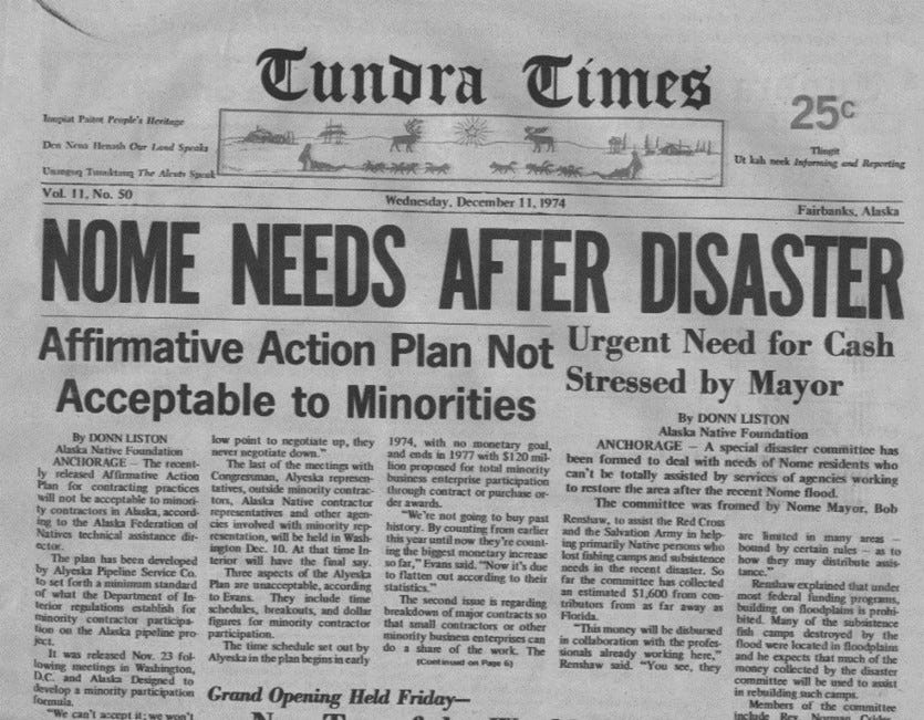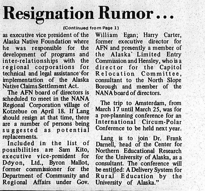 I quit the Daily News to start my own business. One client, The Alaska Native Foundation was headed by long-time friend, Emil Notti, and its mission was to develop information for new corporations under the Act. I became editor of a publication funded by The Ford Foundation called the Alaska Native Management Report. Simultaneously I also wrote for the Tundra Times under the legendary Native editor, Howard Rock.[4]