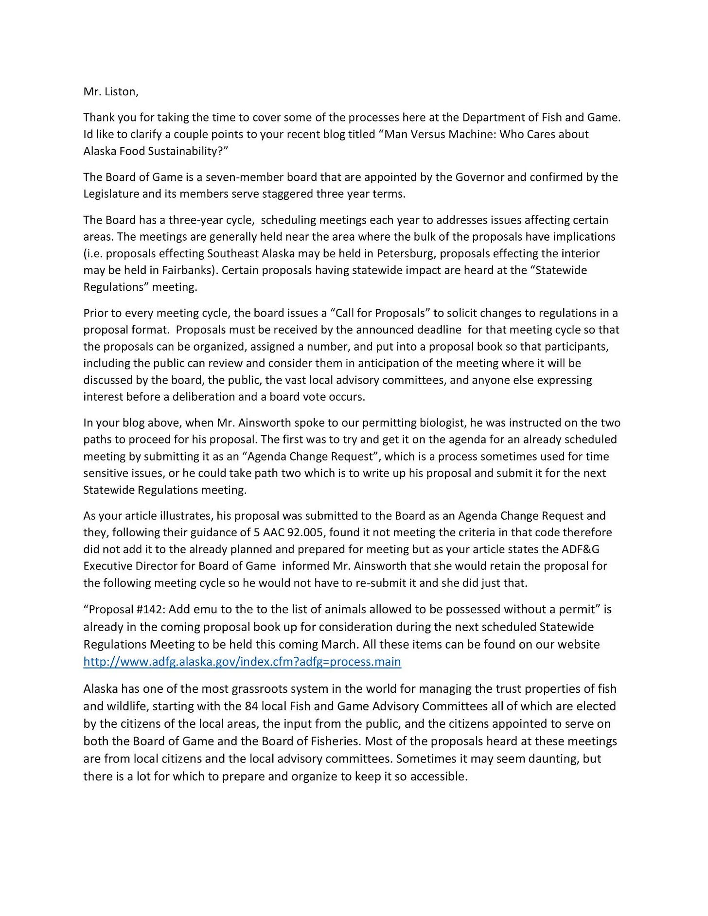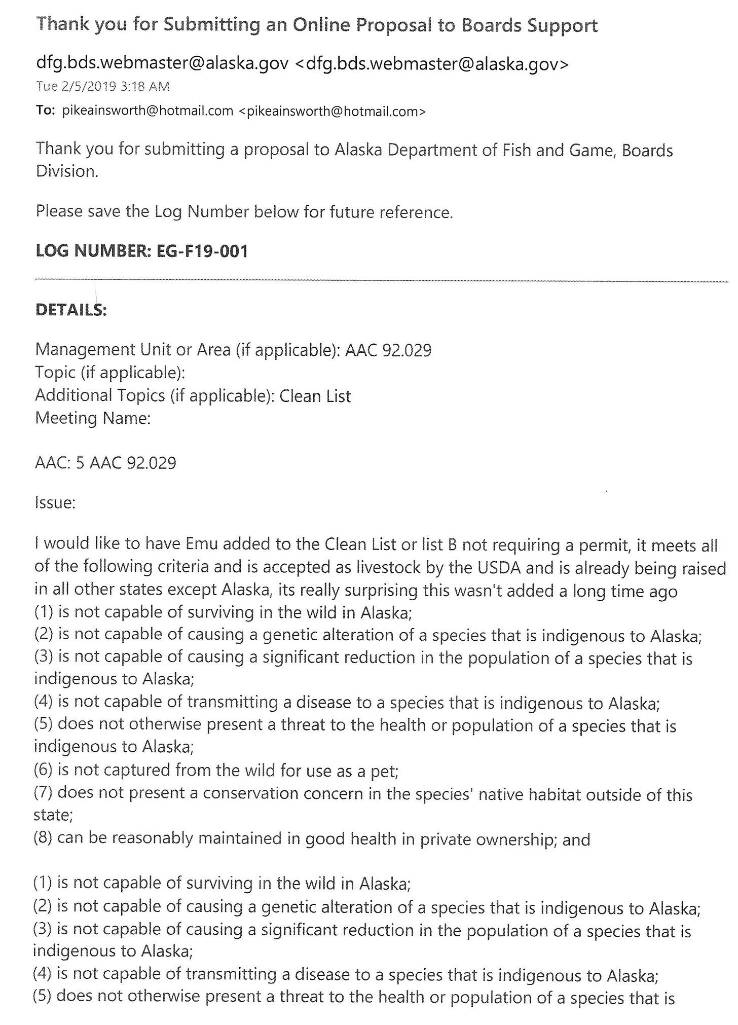 I am sending this email to let you know I have received your proposal to the Board of Game asking to ad Emus to the “clean list” and the Agenda Change Request asking the board to add this topic to their schedule for the upcoming meeting cycle (2019/2020). The Agenda Change Request (ACR) will be scheduled for board consideration following the November 1, 2019 ACR deadline. During that meeting, the board will evaluate the ACR to determine if it makes the criteria under the ACR policy under AAC 92.005. If the board determines it meets the criteria and accepts it, it will then be added to the meeting agenda for either the January or March 2020 meetings. If it is not accepted, the process is to submit a proposal for the Statewide Regulations meeting which will be held early 2021. The proposal you already submitted does not meet the board’s Call for Proposals for the 2019/2020 meeting cycle and therefore will not be included in the board’s proposal book, (emphasis added) but I will retain it for the following year so it’s not necessary for you to resubmit it.