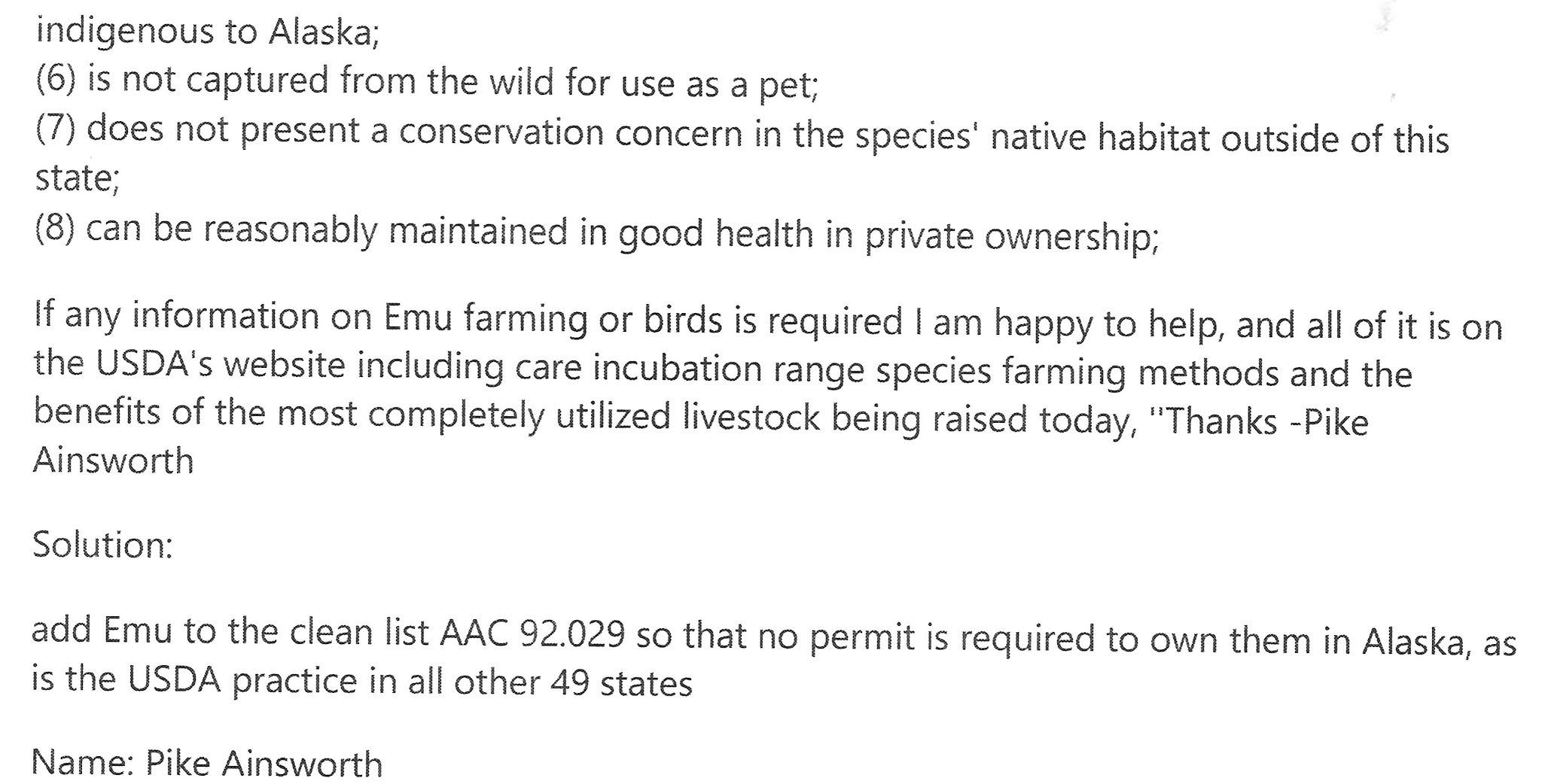 Ainsworth’s response was, in part: I’m hoping to get emu on the clean list of poultry to own in Alaska, they already are in every other State in the US and are considered poultry by the USDA who provides services to emu farmers.