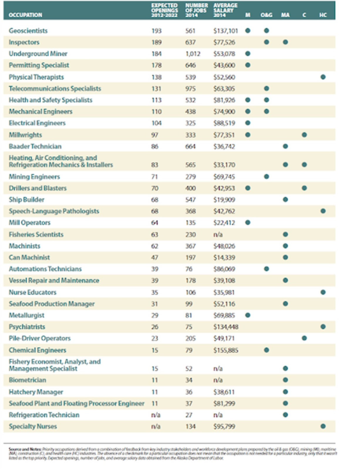 From the McDowell Report: The following first pair of charts detail specific top “priority occupation” skilled jobs in Alaska, with number of expected openings, and wage ranges available.