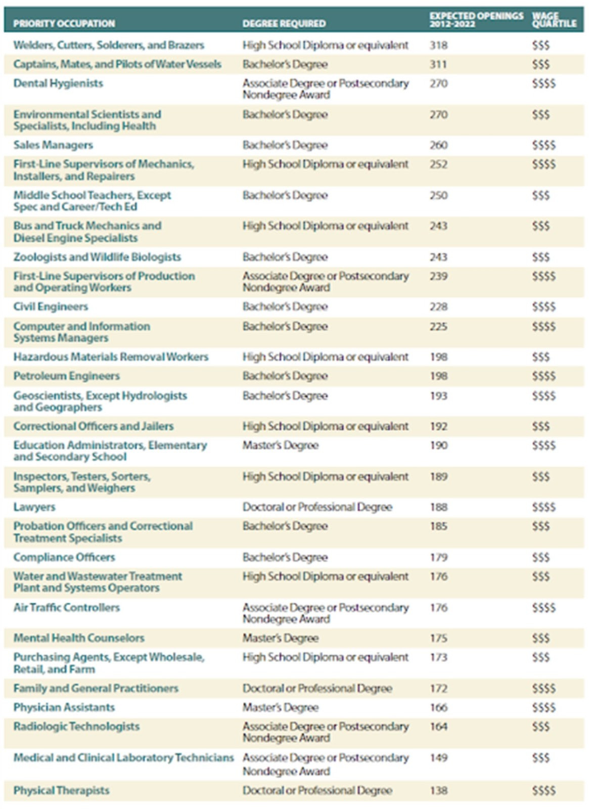 Of 53 listed Priority Occupations in this report, 17 require a minimum of HS Diploma/GED while 8 more mandate an Associate Degree or Postsecondary Non-degree Award. 21 other job categories call for a Bachelor degree and only 3 require a Master’s Degree.