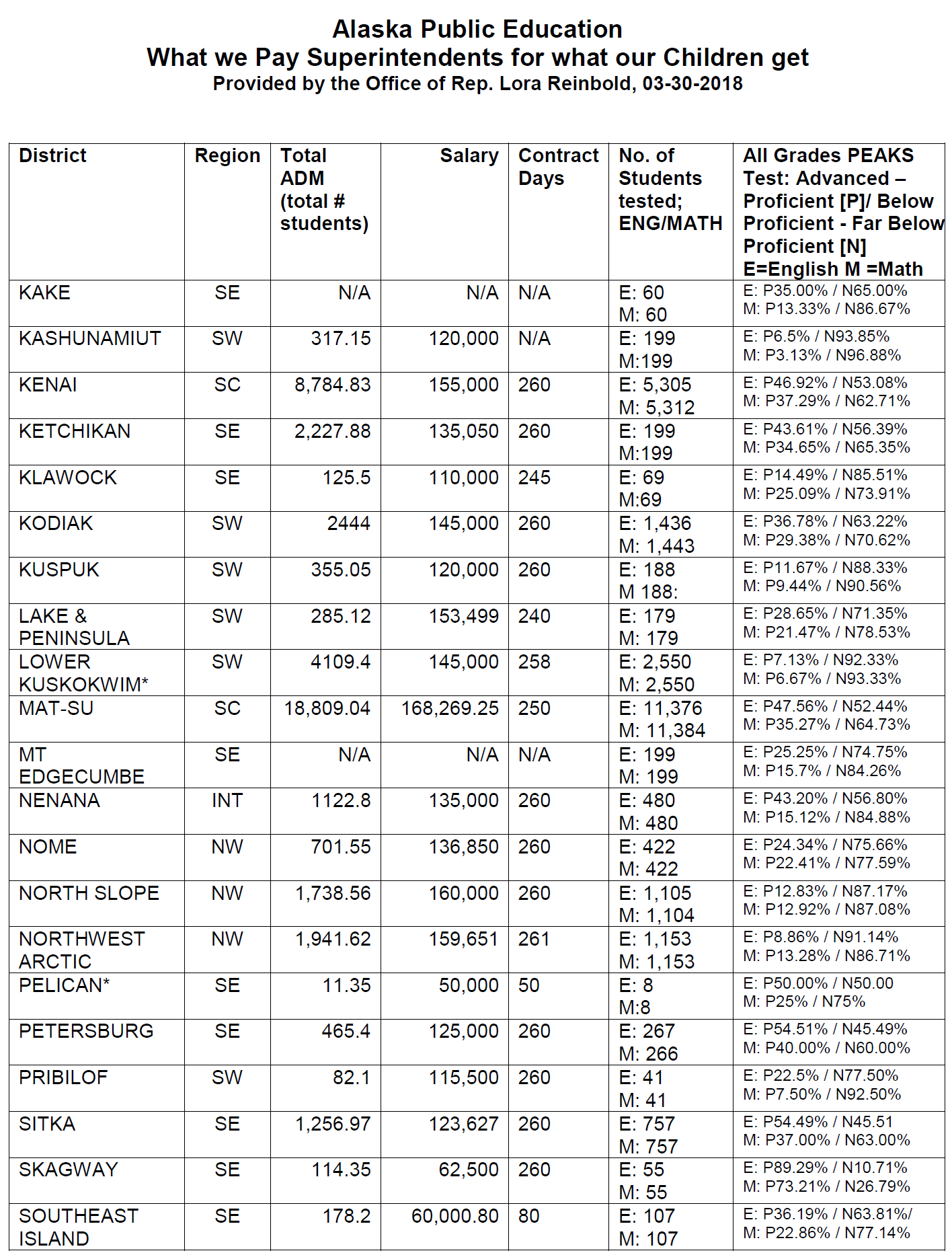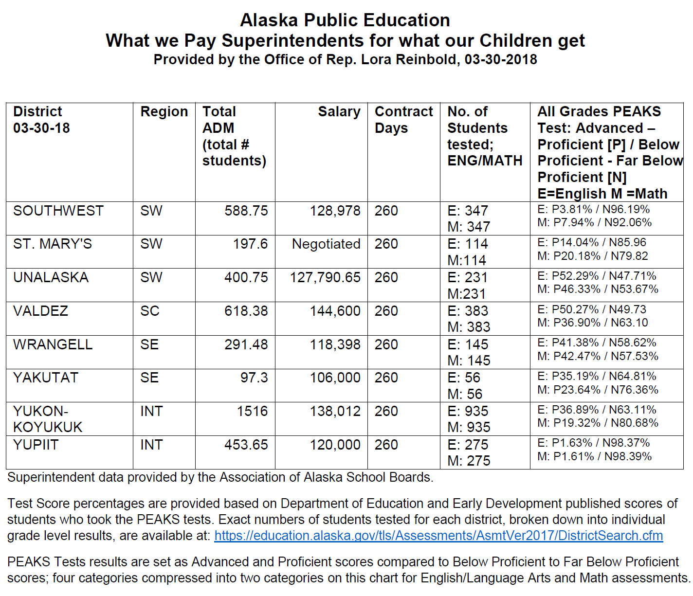 A list of most Alaska school districts, with superintendent salary correlated to Alaska PEAKS Test scores is provided herein. Given the outcomes from investment some may ask how long can we accept this broken system?