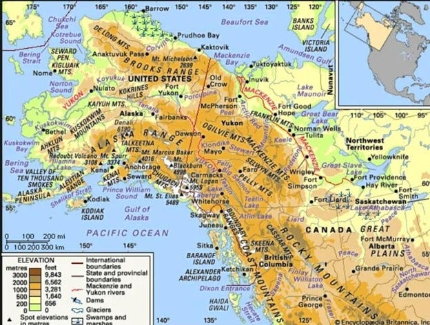 The Alaskan mountain ranges, the Mackenzie and Yukon river basins, and their drainage networks. (Encyclopedia Britannica: Alaska mountains).
