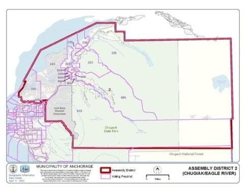 The red border contains the part of Anchorage proposed to be detached from the Municipality by an organization called EaglExit, in accordance with provisions of the Alaska Constitution seeking government closer to local community needs of Alaskans.