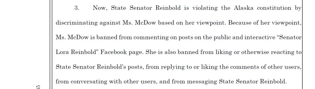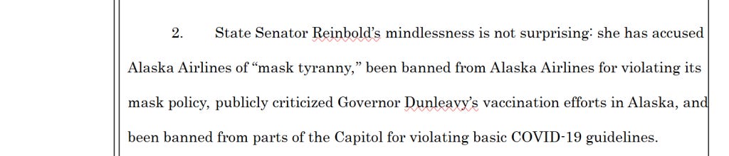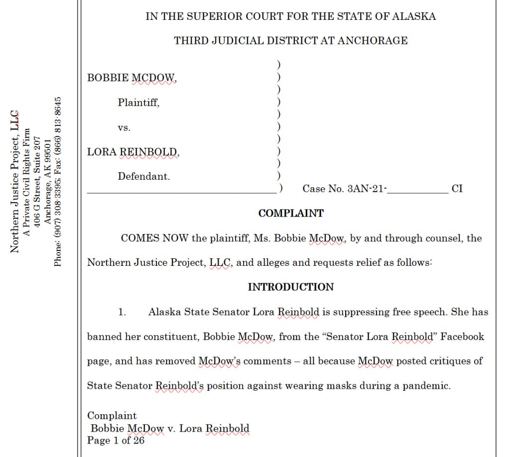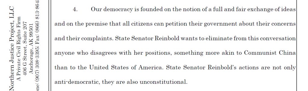 Plaintiff’s case is nothing but platitudes to promote Political Theater. This isn’t a civil rights case, as Northern Justice Project specializes in. This is simply a politically-motivated public spectacle using the Alaska Court System to harass somebody who was doing what a majority of her constituents elected her to do. It hasn’t likely cost McDow a nickle. If the court finds in favor of Reinbold, Plaintiff should have to pay Reinbold’s legal expenses.