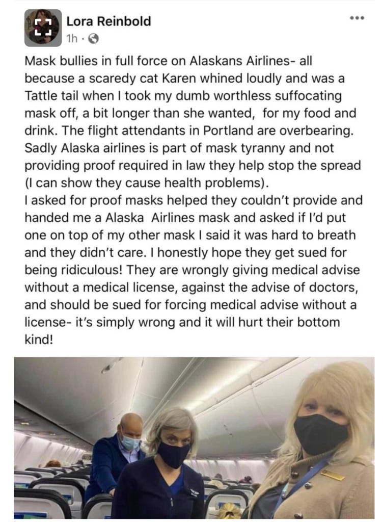 Do you see how this works? It’s about Facebook Glory! When Lora Reinbold didn’t accept as an article of faith that masks protect against a virus–that anything the government says is true–she offended Ms. McDow. And, when Sen. Reinbold had an abusive person creating an on-going FacebookDrama to get attention for herself and the guys at NEA-Alaska/AFL-CIO, she was so BOLD as to cut her off.