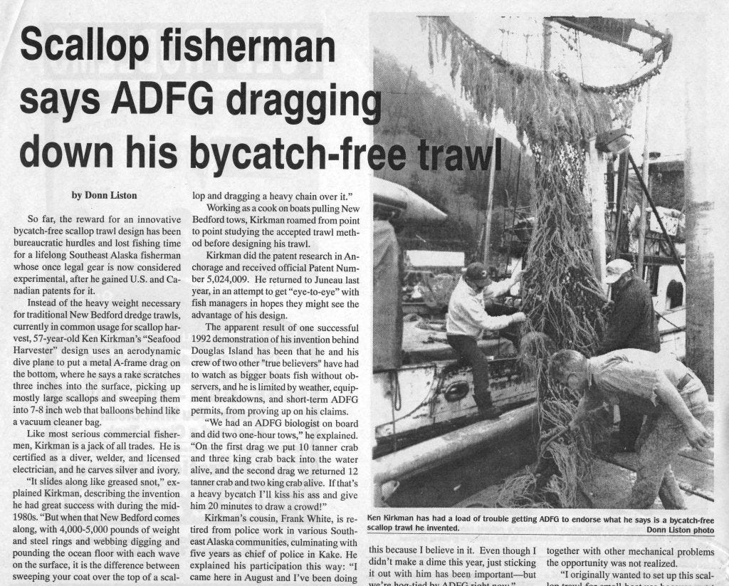 During the mid-1990s I wrote for a Seattle publication called Fishermen’s News which was started by the powerful commercial fishermen’s organization, United Fishermen of Alaska (UFA). That publication is today owned by a Maritime Publishing in San Diego, CA.[4] One story I wrote in March, 1994 was about an innovative bycatch-free trawl designed by a Juneau fisherman who was getting the run-around everybody still gets from the Alaska Department of Fish & Game.[5]