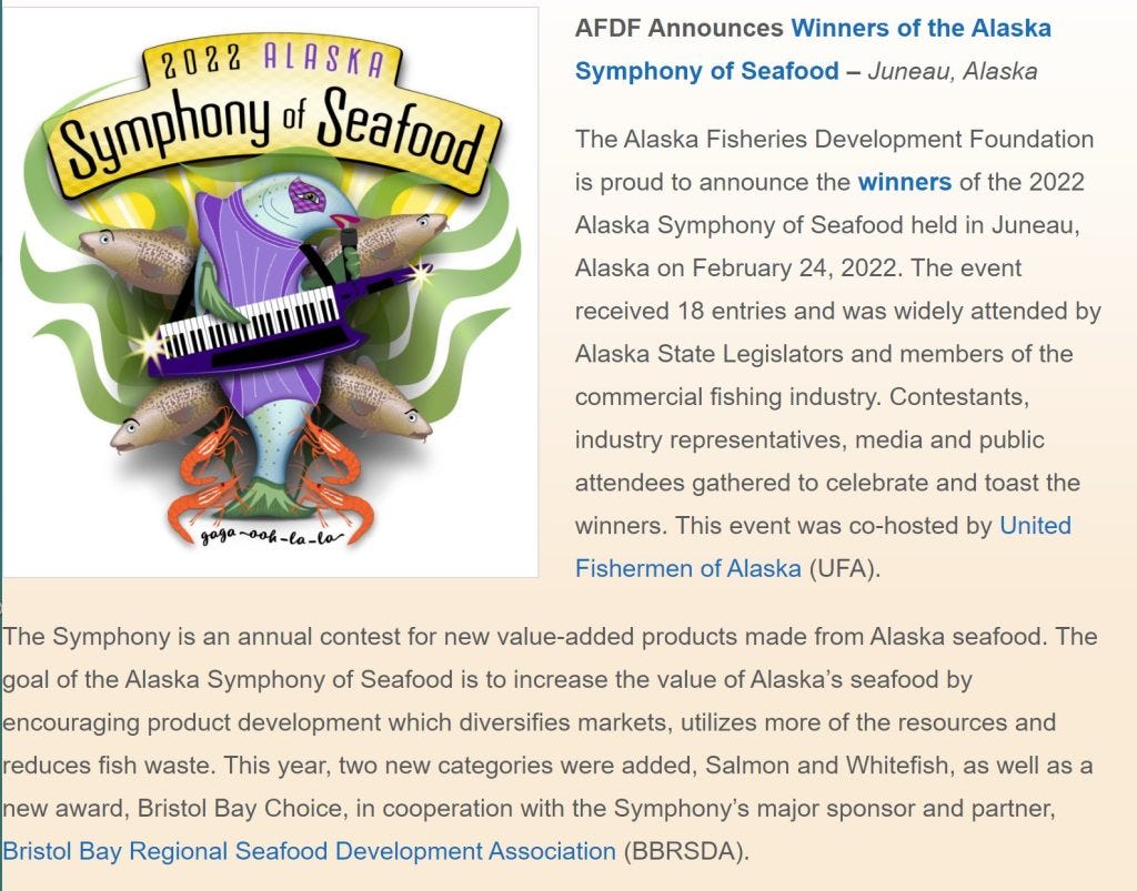 Similarly, AFDE sponsors the Alaska Symphony of Seafood contest in Juneau, where our elected officials are often treated to spectacular seafood “receptions” sponsored by commercial fishing interests, which I have myself enjoyed immensely.
