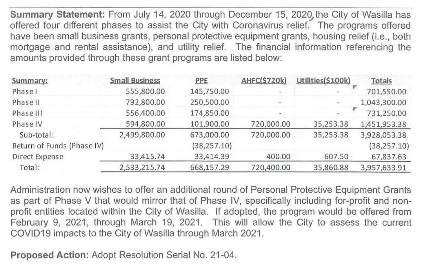The primary concern was for welfare of the passengers and operation of the engine powering the fastest growing region of the state. State orders were enough, although Borough facilities were closed. An election brought a new Captain, former deputy mayor Glenda D. Ledford, to the command helm. At the January 25, 2021 Regular Meeting Captain Ledford reported to the city council that she had not instituted any new regulations in response to the COVID-19 pandemic. At the February 10, Wasilla City Council meeting Relief and Recovery Grants Program Phase V funding was approved.
