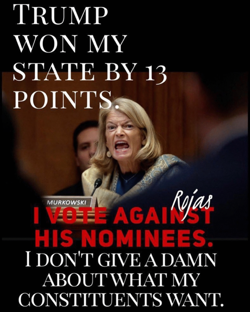 Imagine if AK Sen. Murkowski DID CARE what a majority of her constituents want? Her stature–as the unworthy appointee of her father, former Sen. Frank Murkowski, upon his election as governor–continues to decline. Alaskans have learned Murkowski was one of the architects of Ranked Choice Voting after she had been primaried by the AK Republican Party.