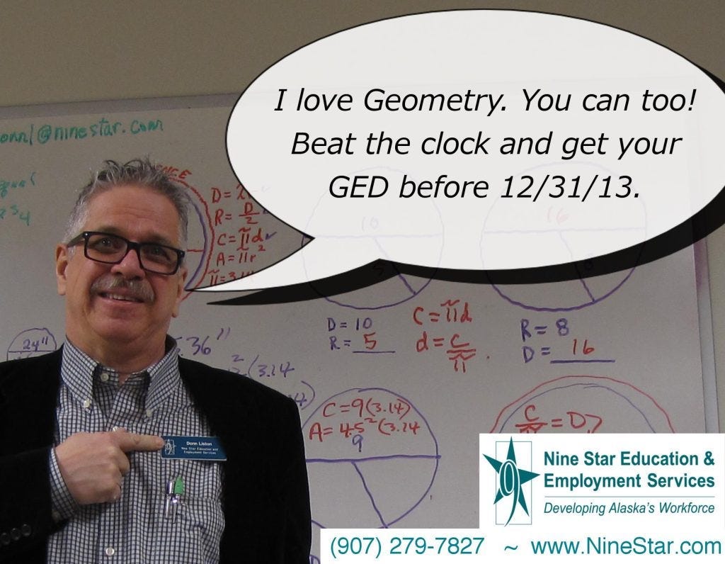 The General Equivalency Degree was originally established during the early 1940s for military personnel returning from serving their country during World War II. Many left home before graduating high school, but service in war had been an education. Now they needed meaningful work. As public education bustled with baby-boomers seeking their American Dreams in schools designed as education factories after the war, many who were unable to be successful in public education either quit, gave up or were kicked out. There may be other reasons for needing a GED, but Alaska has traditionally suffered a high number of “drop-outs.” Today somewhere between 60-80 percent of public school students who started in kindergarten graduate high school in Alaska.
