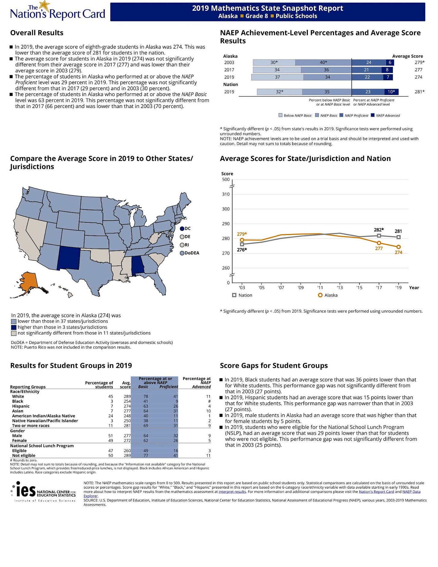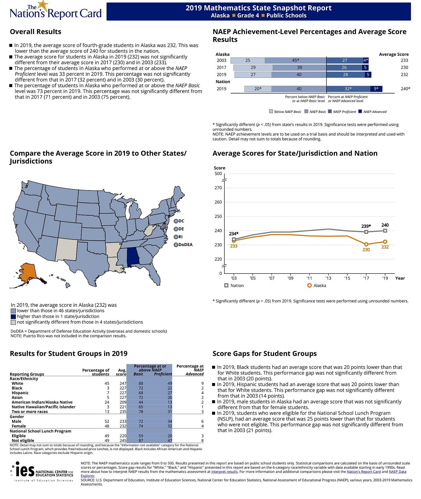 In math, 33 percent of Alaska 4th Grade students were proficient, ranking our state at a shameful 46th among the 50 states in 2019. This has not changed since 2003. At the NCES interactive web page comparisons can be made between Alaska and any other state of the nation.