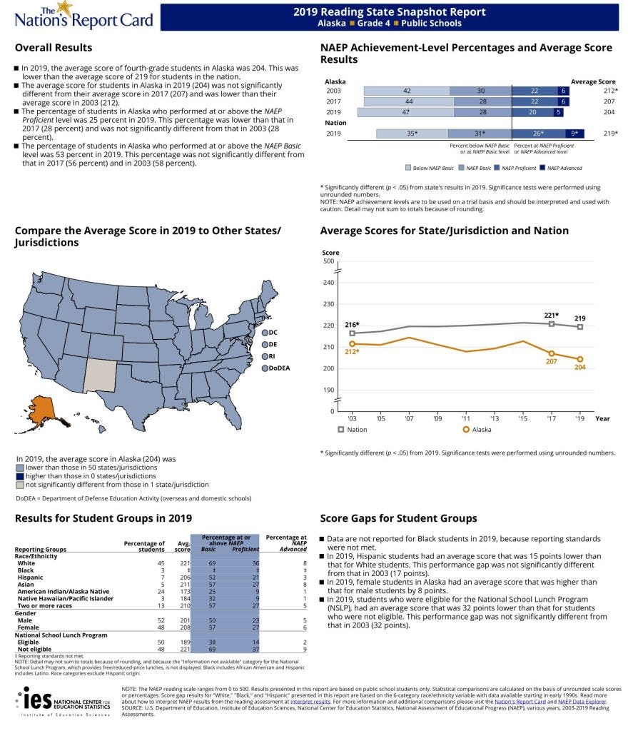 Reading scores for Alaska 4th grade students were also among the lowest of the nation in 2019. Overall, 25 percent were proficient in Reading. This is a consistent theme of our Alaska schools.