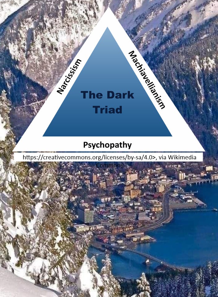 We know The Dark Triad is prevalent today in Backwaters Juneau specifically because Alaska lawmakers do not recognize their obligation to obey the law regarding distribution to Alaskans of the Alaska Permanent Fund dividend. Instead AK Elected officials go to Juneau to pass record budgets.
