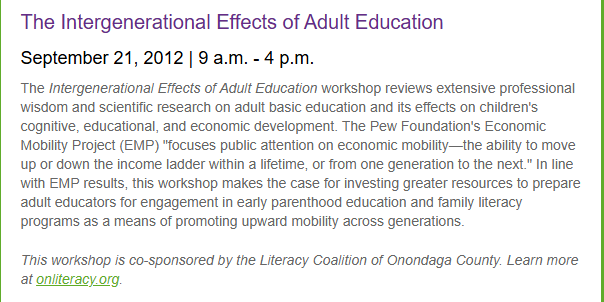 [1] “The Intergenerational Effects of Adult Education”. Literacy Coalition of Onondaga County. August 13, 2012. Archived from the original on April 2, 2015. Retrieved March 3, 2015.